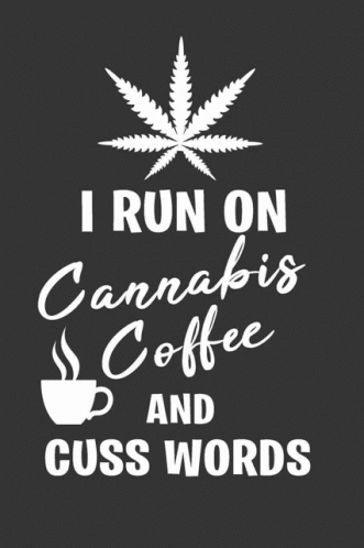Опис на содржините: a poster that says " i run on cannabis coffee and cuss words " with a marijuana leaf and a cup of coffee