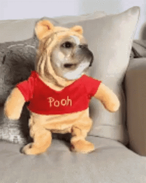 Опис на содржините: a dog in a winnie the pooh costume is sitting on a couch .