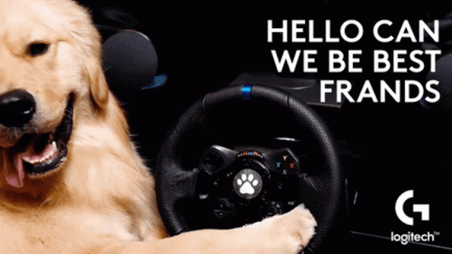 Опис на содржините: a dog is sitting in a car with a steering wheel and the words " hello can we be best frands "