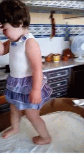 Опис на содржините: a little girl wearing a blue and white dress is standing on a table