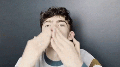 Опис на содржините: a young man is cleaning his nose with his hands against a blue background .