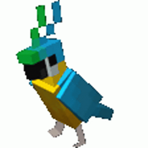 Опис на содржините: a pixel art of a blue and yellow parrot with a green hat .