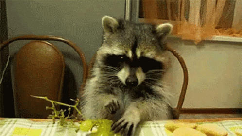 Опис на содржините: a raccoon sits at a table eating grapes and cookies