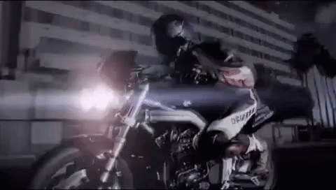Опис на содржините: a man is riding a motorcycle on a city street at night .