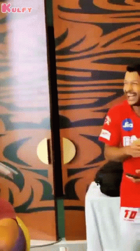Опис на содржините: a man wearing a red shirt with the number 10 on it is smiling