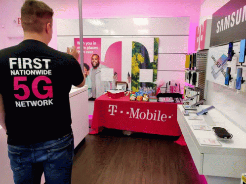Опис на содржините: a man wearing a first nationwide 5g network shirt stands in front of a t-mobile table