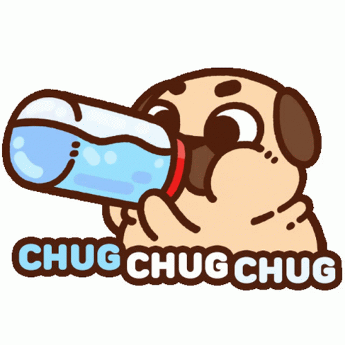 Опис на содржините: a cartoon of a pug drinking water with the words chug chug chug