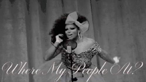 Опис на содржините: a drag queen is singing into a microphone with the words where my people all written below her