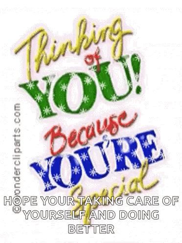 - ഉള്ളടക്കത്തിന്റെ വിവരണം: a greeting card that says `` thinking of you because you 're special hope your taking care of yourself and doing better ''