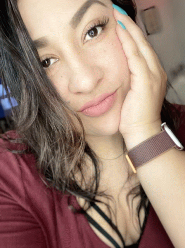 ഉള്ളടക്കത്തിന്റെ വിവരണം: a woman wearing a maroon shirt and a brown watch holds her hand to her face