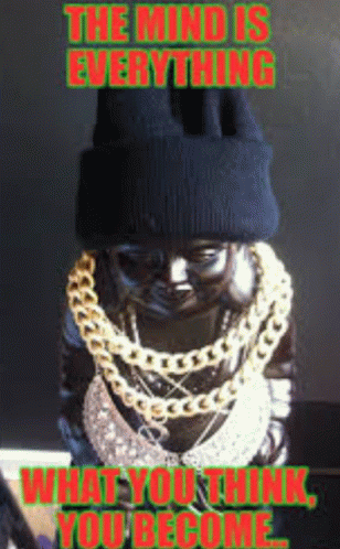 ഉള്ളടക്കത്തിന്റെ വിവരണം: a buddha wearing a beanie and chains says the mind is everything