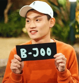 ഉള്ളടക്കത്തിന്റെ വിവരണം: a man wearing an orange sweater and white hat is holding a sign that says b-joo