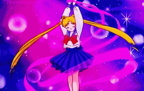 ഉള്ളടക്കത്തിന്റെ വിവരണം: sailor moon is holding a pink ribbon in her hands while dancing in the air .