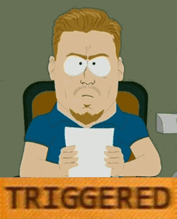 ഉള്ളടക്കത്തിന്റെ വിവരണം: a cartoon man holding a piece of paper behind a sign that says triggered on it