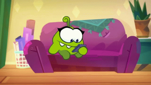 ഉള്ളടക്കത്തിന്റെ വിവരണം: a green cartoon character is sitting on a purple couch looking at a cell phone