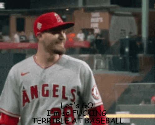 - ഉള്ളടക്കത്തിന്റെ വിവരണം: a baseball player wearing an angels jersey says " let 's go i 'm so fucking terrible at baseball "