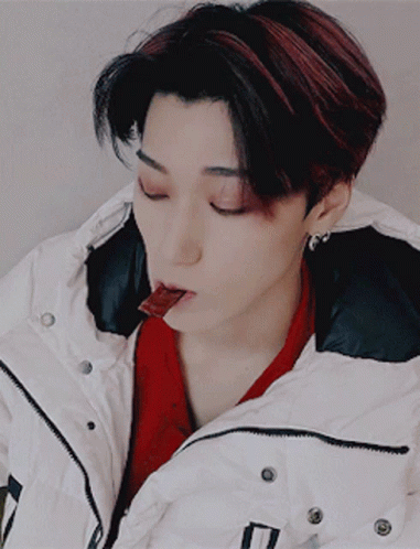 ഉള്ളടക്കത്തിന്റെ വിവരണം: a young man wearing a white jacket and a red scarf is eating a piece of chocolate