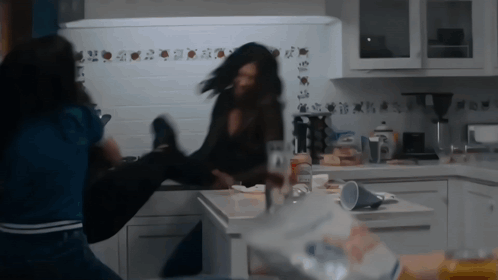 ഉള്ളടക്കത്തിന്റെ വിവരണം: a woman is kicking another woman in the face in a kitchen ..