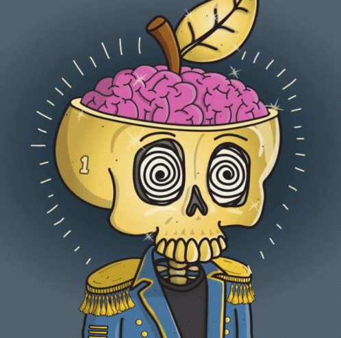 ഉള്ളടക്കത്തിന്റെ വിവരണം: a cartoon drawing of a skull with a spiral in his eyes