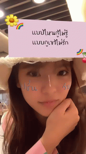 ഉള്ളടക്കത്തിന്റെ വിവരണം: a woman wearing a hat has a sign on her head that says ' แบบ บ้าน ' on it