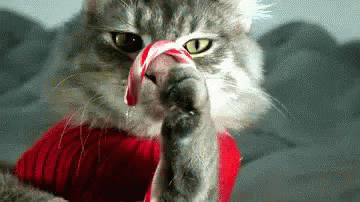 ഉള്ളടക്കത്തിന്റെ വിവരണം: a cat in a red sweater is licking a candy cane .