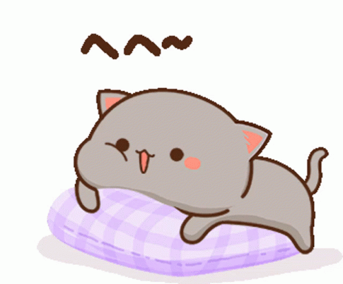 ഉള്ളടക്കത്തിന്റെ വിവരണം: a cartoon cat laying on a purple pillow with a smiley face