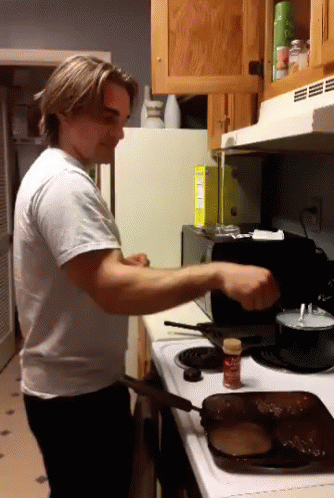ഉള്ളടക്കത്തിന്റെ വിവരണം: a man in a white shirt is cooking on a stove with a box of corn flakes behind him
