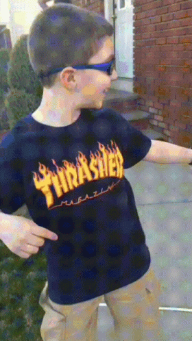ഉള്ളടക്കത്തിന്റെ വിവരണം: a young boy wearing a black thrasher t-shirt is pointing