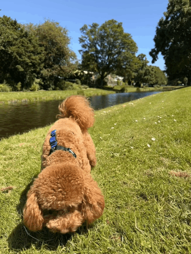 ഉള്ളടക്കത്തിന്റെ വിവരണം: a small brown dog with a blue leash is laying in the grass near a river