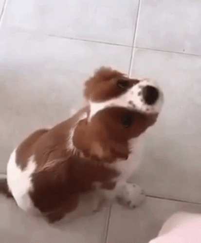 ഉള്ളടക്കത്തിന്റെ വിവരണം: a brown and white dog is sitting on a tiled floor looking up .
