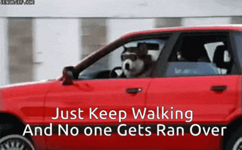 ഉള്ളടക്കത്തിന്റെ വിവരണം: a dog is driving a red car with the words just keep walking and no one gets ran over below it