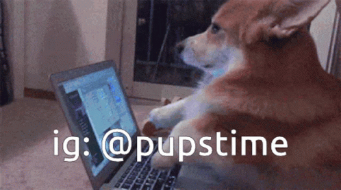 ഉള്ളടക്കത്തിന്റെ വിവരണം: a dog sitting in front of a laptop with the hashtag @pupstime on the bottom
