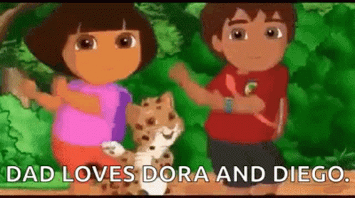 ഉള്ളടക്കത്തിന്റെ വിവരണം: a cartoon of dora and diego standing next to a leopard .