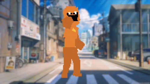 ഉള്ളടക്കത്തിന്റെ വിവരണം: a pixel art of a person standing on a street in front of a building that says ' bakery ' on it