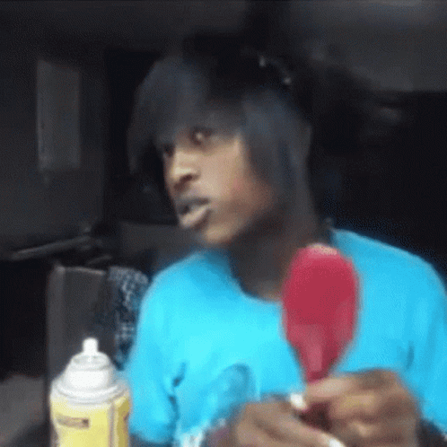 ഉള്ളടക്കത്തിന്റെ വിവരണം: a man in a blue shirt is holding a red brush and looking at himself in a mirror .