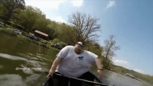 ഉള്ളടക്കത്തിന്റെ വിവരണം: a man in a white shirt is paddling a canoe on a lake