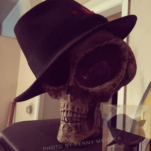 ഉള്ളടക്കത്തിന്റെ വിവരണം: a skull wearing a black top hat is displayed by penny meister