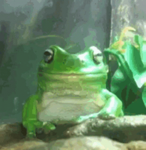 ഉള്ളടക്കത്തിന്റെ വിവരണം: a green frog is sitting on a rock in a glass aquarium .