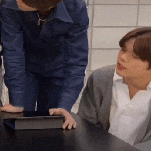 ഉള്ളടക്കത്തിന്റെ വിവരണം: a man in a blue jacket is standing next to a man in a grey cardigan