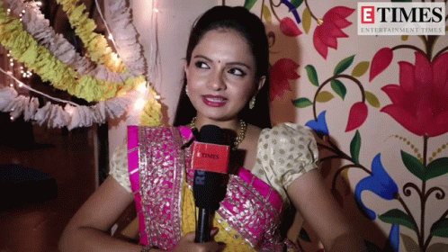 ഉള്ളടക്കത്തിന്റെ വിവരണം: a woman is holding a microphone in front of a wall that says etimes