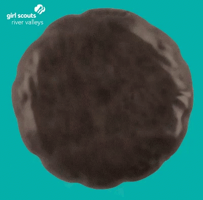 ഉള്ളടക്കത്തിന്റെ വിവരണം: a girl scouts river valleys logo is behind a chocolate cookie