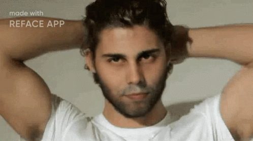 ഉള്ളടക്കത്തിന്റെ വിവരണം: a man in a white shirt has his hands behind his head and is made with reface app