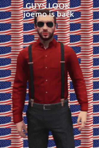 ഉള്ളടക്കത്തിന്റെ വിവരണം: a man in a red shirt and suspenders stands in front of an american flag background