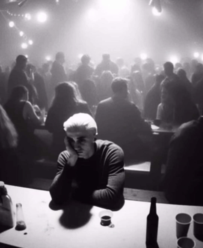 ഉള്ളടക്കത്തിന്റെ വിവരണം: a man sitting at a table in a crowded room