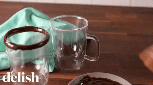 - ഉള്ളടക്കത്തിന്റെ വിവരണം: two cups with chocolate rims on a wooden table with the word delish in the upper right corner