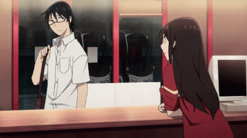ഉള്ളടക്കത്തിന്റെ വിവരണം: a man and a woman are standing next to each other in front of a window that says ' tokyo '