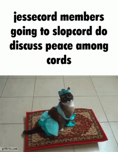 - ഉള്ളടക്കത്തിന്റെ വിവരണം: a cat is sitting on a rug with the words jessecord members going to slopcord do discuss peace among cords written above it