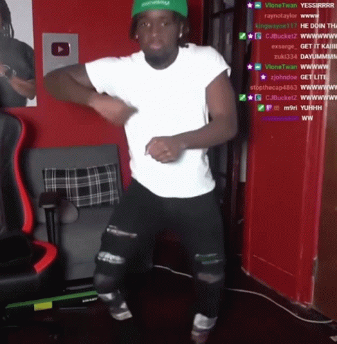 ഉള്ളടക്കത്തിന്റെ വിവരണം: a man in a green hat is dancing in a room