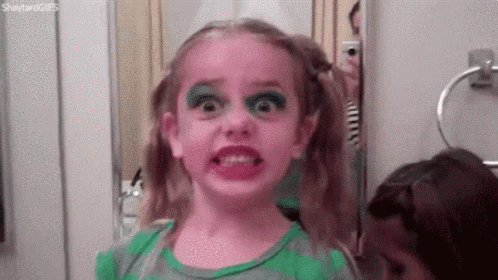 ഉള്ളടക്കത്തിന്റെ വിവരണം: a little girl is making a funny face in front of a mirror while wearing makeup .