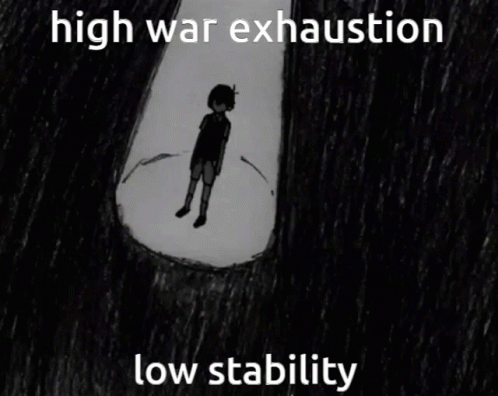 - ഉള്ളടക്കത്തിന്റെ വിവരണം: a drawing of a boy with his head in his hands with the words high war exhaustion low stability below him